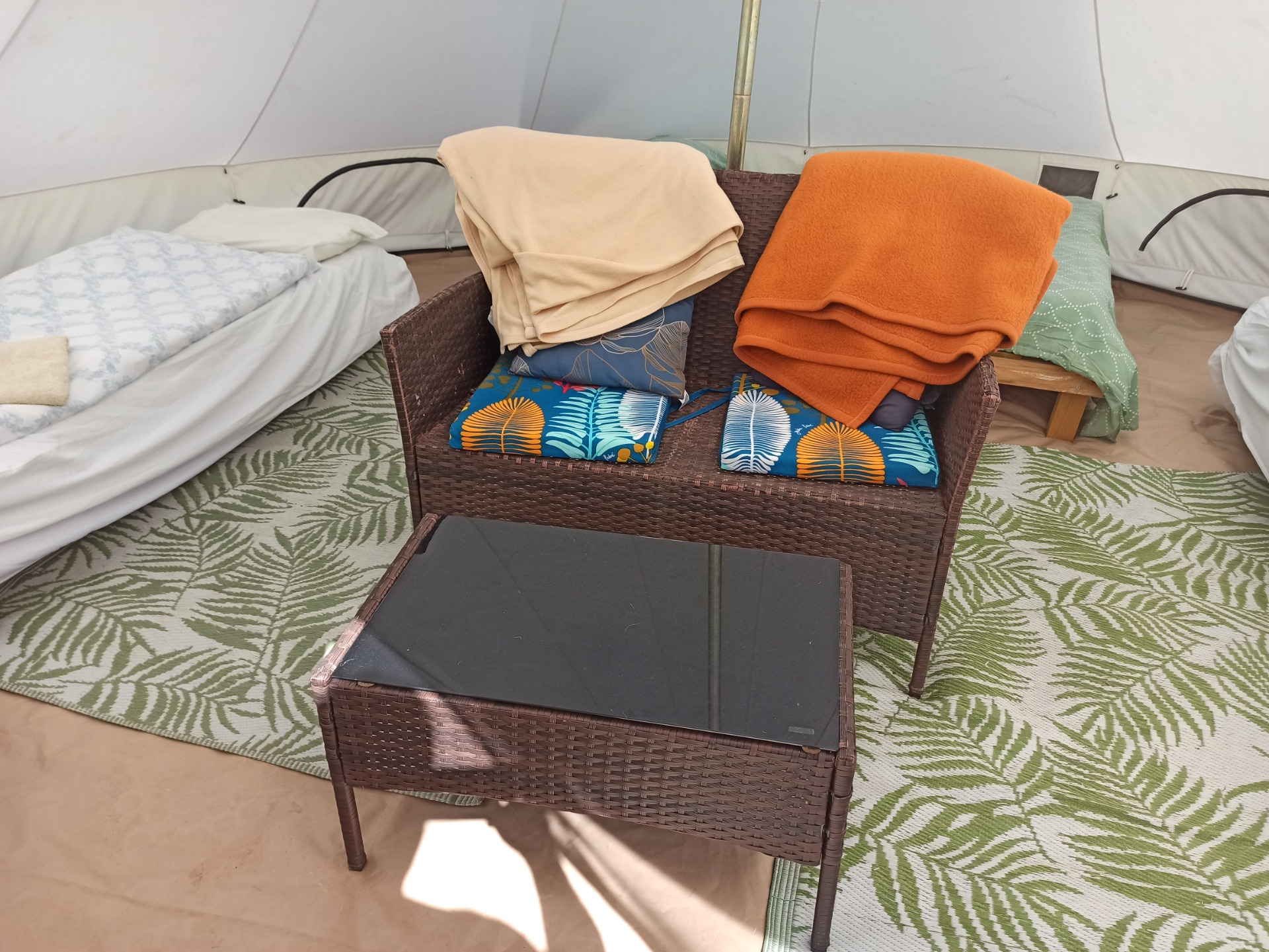 Nous avons trois grandes tentes berbères, équipées de lits standards. Deux de ces tentes sont pour 4 personnes et une pour 5 personnes. Elles offrent amplement d’espace pour ranger vos bagages et disposent également d’un accès à l’électricité. Il y a trois douches, ainsi que des toilettes à eau et sèches, à partager avec les autres campeurs. De plus, deux cuisines extérieures couvertes et entièrement équipées sont à votre disposition.